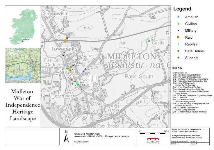 A follow-up post will discuss these maps and their different site locations in more detail. It is my hope that the Ambush and Reprisal Landscape map, in conjunction with a modified version of the Midleton Ambush map we produced for Cork County Council (see page 159 of the Heritage Centenary Sites book by clicking here) could form the basis of an information panel located on or near Midleton’s Main Street to impart information on the events of late 1920 and early 1921 to both locals and tourists in time for the 2020 centenary of the ambush. That is an undertaking we will be actively seeking support for within the local community in the coming months, so do let us know if it is something you would like to see! In the meantime, we hope you enjoy exploring the map in more detail.
