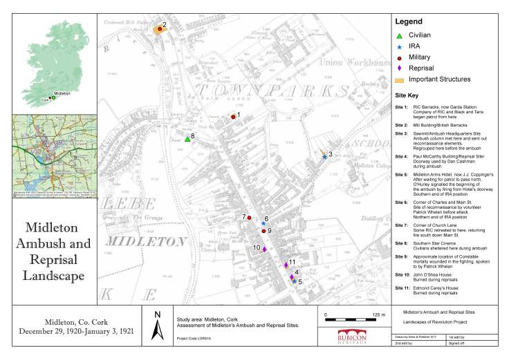 Demonstrating how surviving elements of Ireland’s landscapes of revolution can be identified is the central aim of this project. There has never been a nationwide effort to undertake this work, which is vital if we are to appropriately manage our Revolutionary-era heritage. Following on from projects such as the one undertaken at Knockraha, we began investigating the surviving landscape of the 1920 Midleton Main Street Ambush and subsequent official British reprisals. Much of that work has been the subject of previous posts on the site (e.g. see here and here).