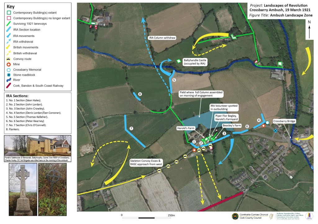 Our latest map is the fourth in the series commissioned by Cork County Council, and examines the archaeological landscape of the famed Crossbarry Ambush of 19 March 1921. Famous for the scale of IRA involvement, which ran to more than 100 Volunteers, the archaeological landscape of Crossbarry retains many of its 1921 features. Most notable among these are the Harold and Beasley farmsteads which formed the centre of the IRA position. It was here that piper Flor Begley famously played his pipes during the engagement, and where one of the IRA was spotted by the British lorries as they exited onto some outhouse steps, causing them to halt before they had fully entered the killing zone.