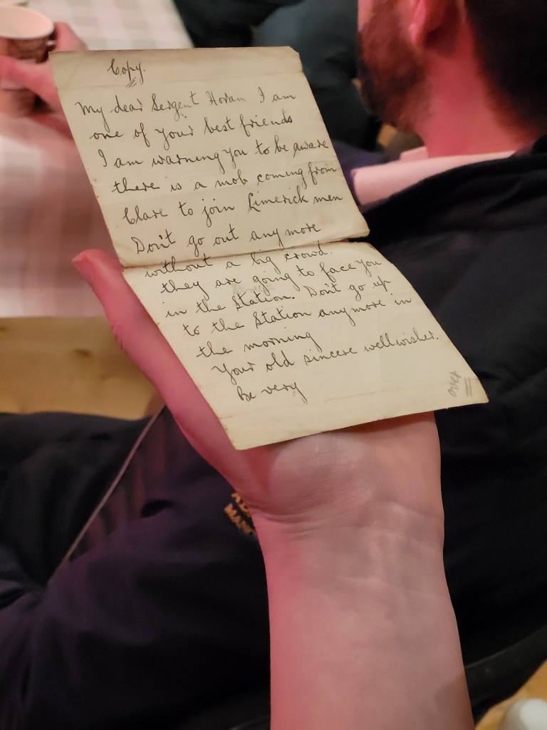 In addition, we saw a diary which once belonged to a member of the IRA who had been on the run, a small British flag picked up as a souvenir during fighting in 1922, and a letter to RIC Sergeant Horan warning him that his life was in danger. Could this be the notorious Sergeant James Horan?