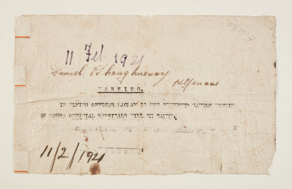 Meanwhile, British efforts to secure Officer MacKay’s release were well underway. Clancy’s house at Cush was burned, and 20 aircraft flew over Kilfinane dropping smoke bombs and leaflets on the town. One of these leaflets is now held at the National Museum of Ireland and reads, ‘Warning – If Flying Officer MacKay is not returned safely within 48 hours, official reprisals will be taken’.