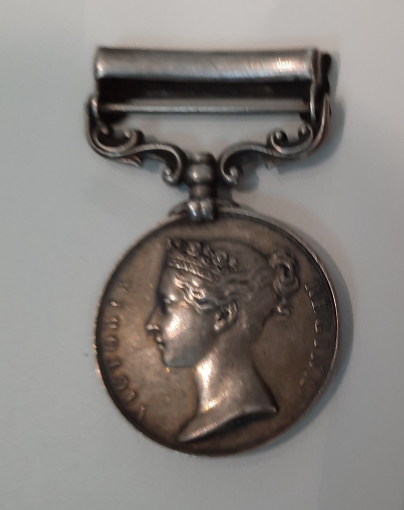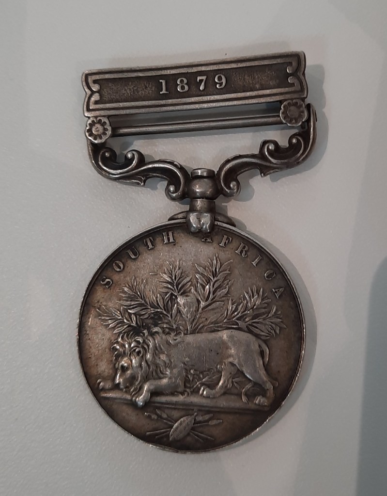 The medal dates from 1879 and depicts Queen Victoria on one side and a crouching lion in front of a protea bush (the national flower of South Africa) on the other. The medal was mainly associated with the Anglo-Zulu War of 1879. How Sean T O’Riordan came to possess such a medal is unknown; perhaps it was taken from some of the British forces he encountered.