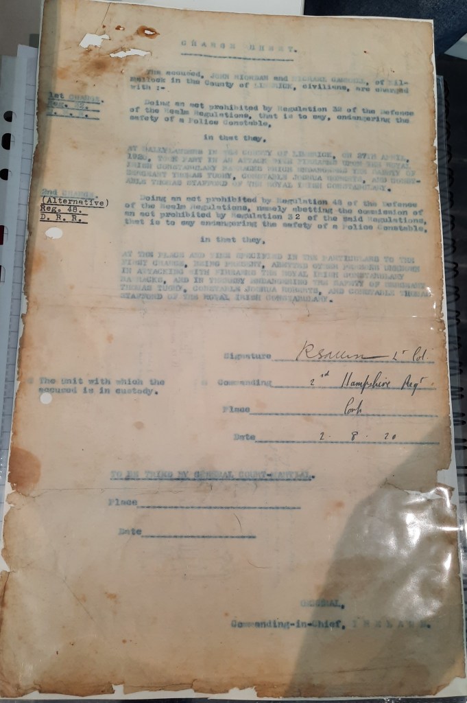 We were shown the original charge sheets and confirmation of the sentence in relation to Sean T O’Riordan and Michael Gammell, who were both court-martialled by a British Army court. While such documents survive in British archives for use by researchers, the survival of original copies handed to defendants such as Sean T O’Riordan is rare. Their condition and care are a testament to the appreciation of families for their personal and historical importance.