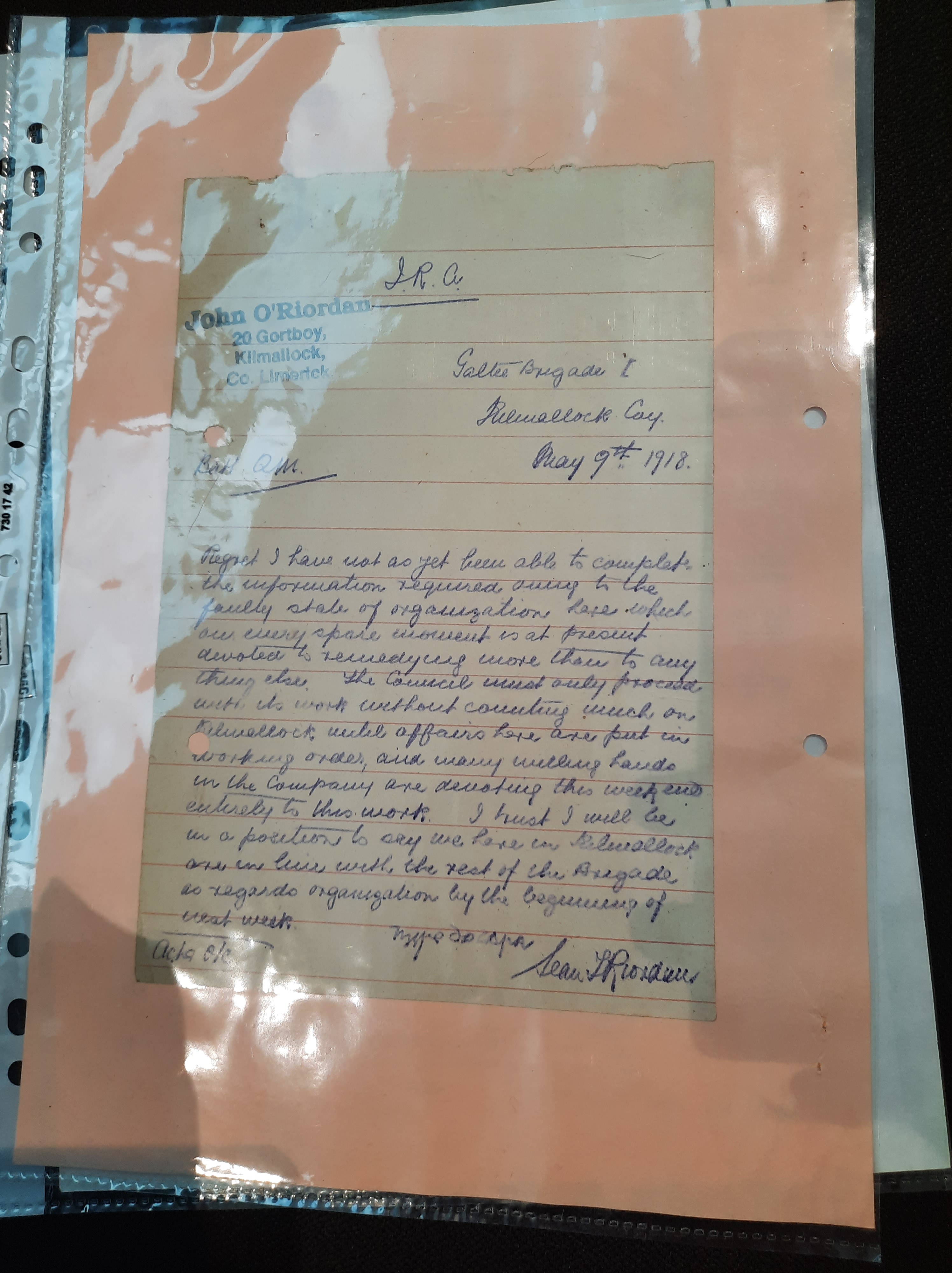 During the evening, we were shown more documents, including original letters and correspondence from 1918 relating to local organisational matters of the Galtee Battalion of the Irish Volunteers, to which many parts of southeast Limerick were affiliated for an extended period. Some later documents included correspondence from Sinn Fein headquarters and follow-up local material pertaining to the extraordinary Ard-Fheis organised by Sinn Fein in the aftermath of the January 1922 Dail vote in favour of the Anglo-Irish Treaty.