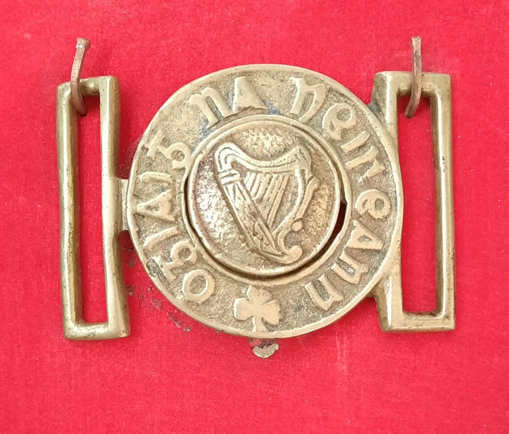At the worshop we were also kindly shown Service Medals for a husband and wife. The smaller medal on the left belonged to Bridget Jones, who was a member of Cumann na mBan, and the larger medal on the right belonged to her husband, Volunteer Owen Hickey. It’s so unusual to see a husband and wife’s medals side by side; it was a real treat. We were also shown the belt buckle of a….