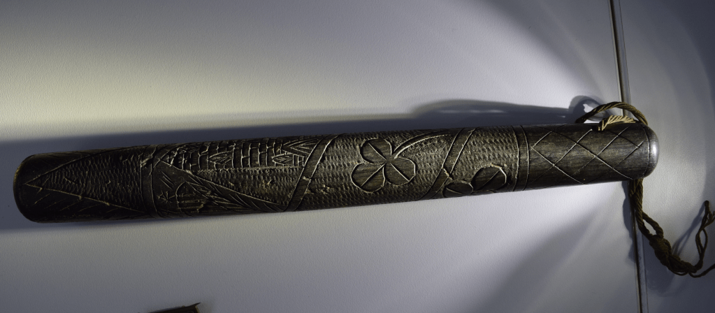 When O’Riordan and Gammell were arrested for the attack on Ballylanders, they were imprisoned in England. According to a newspaper obituary, they had been on hunger strike there. Michael Gammell’s grandson remembers hearing they were imprisoned on the Isle of Wight, and while there, Michael created this beautifully decorated baton incised with images of shamrocks and round towers.