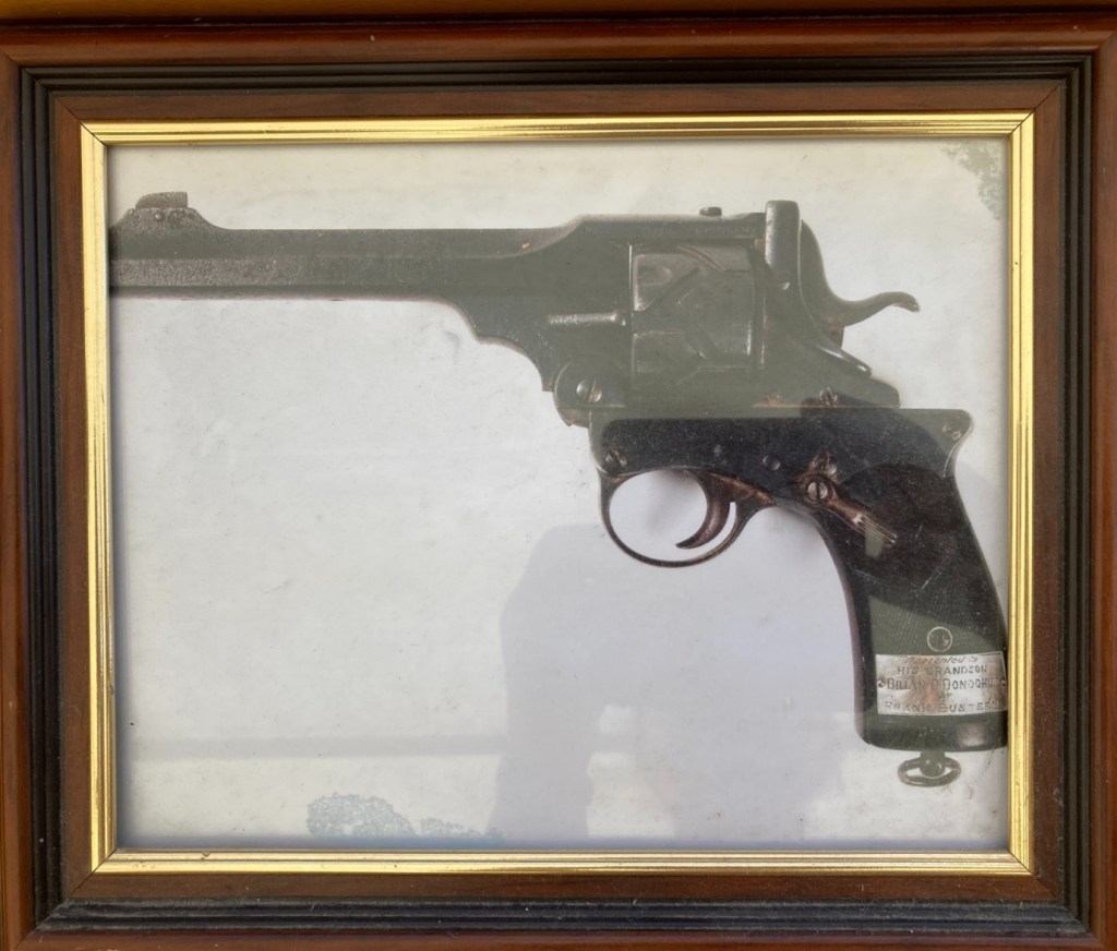His personal effects, including his ‘Webley-Fosbery’ self-cocking revolver, a framed photo of which is shown here, have been donated by his family to Cork Public Museum. This type of revolver was produced by Webley & Scott from 1901 until 1924. The production run was fairly low making these particular revolvers relatively rare.