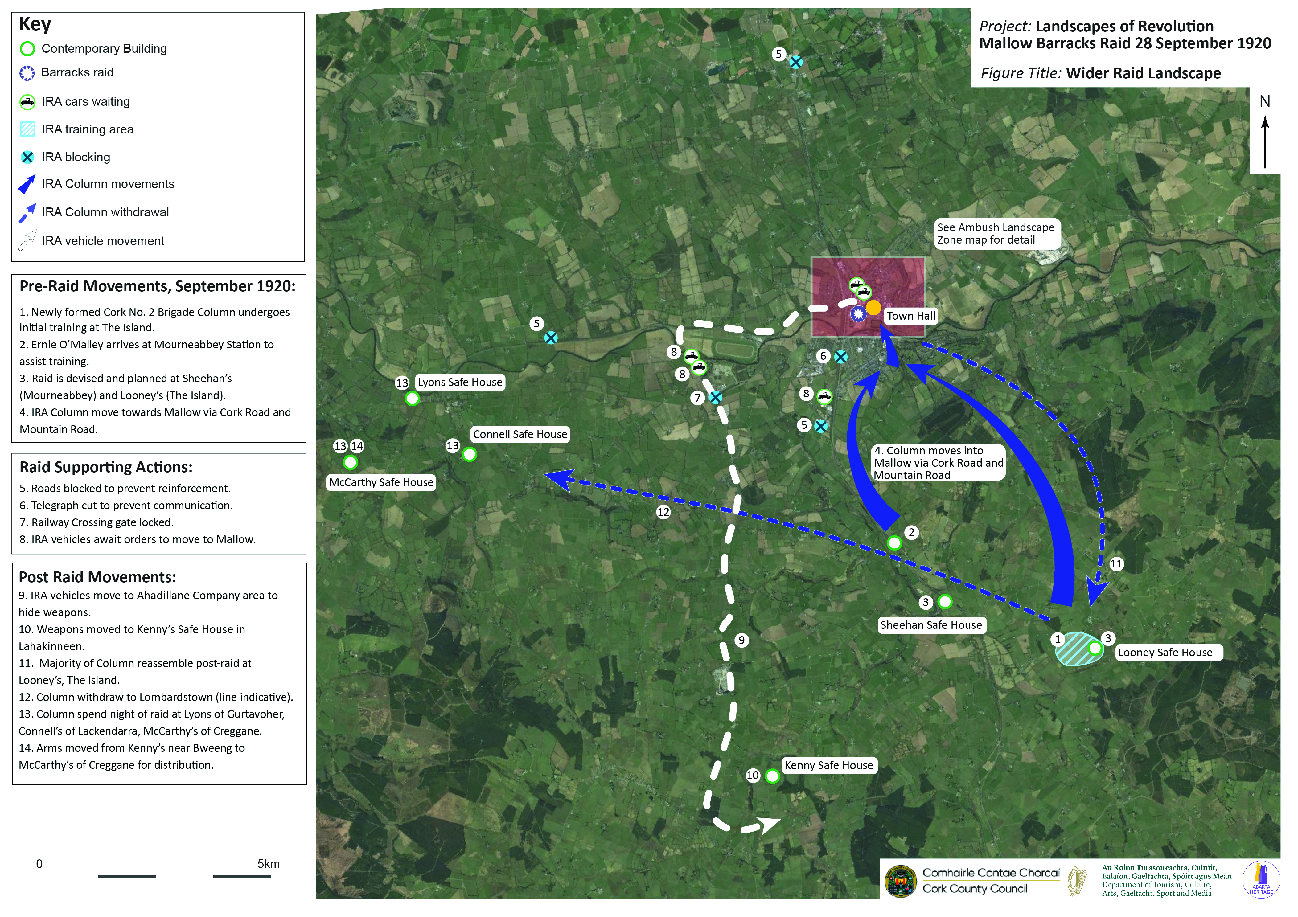 The Mallow Raid Mapping Project is funded as part of Cork County Council’s Decade of Centenaries Programme financed by the Department of Tourism, Culture, Arts, Gaeltacht, Sport and Media. It is being delivered by Abarta Heritage as part of the Landscapes of Revolution Project.
