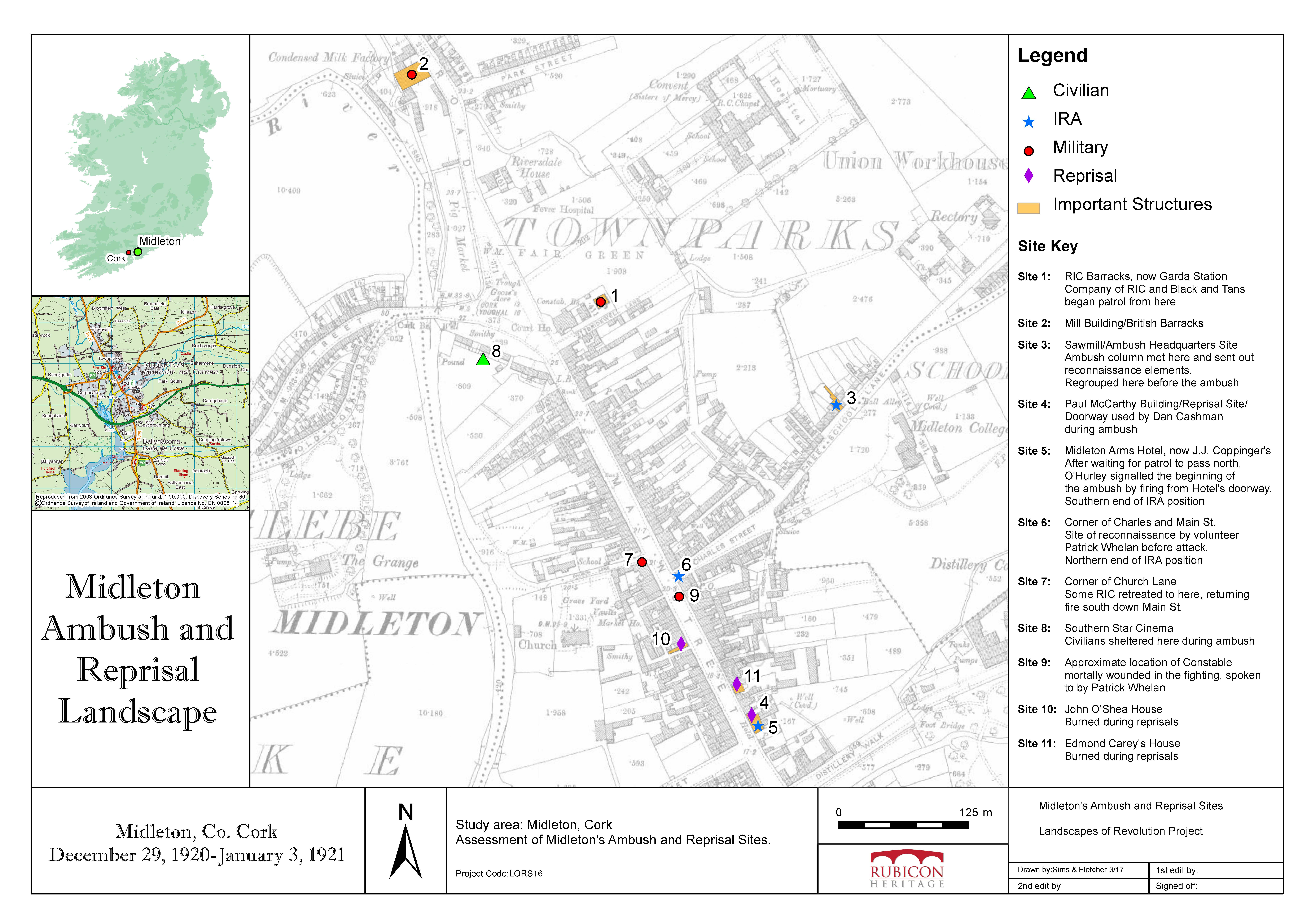 The Landscapes of Revolution Project has undertaken extensive work to identify, locate and promote the archaeological landscape of the ambush that took place in Midleton, Co. Cork on 29 December 1920. The attack, which occurred on the town’s Main Street, resulted in the deaths of three members of an RIC patrol, and led to the first official reprisals during the War of Independence. In addition to identifying the key elements of the site and engaging with the local community to uncover further details about the event, Landscapes of Revolution has also led a programme of interpretation at the site, which it is envisaged will lead to the installation of an interpretive panel in the near future.