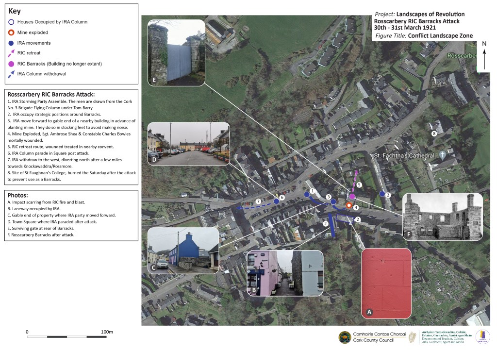 The Landscapes of Revolution Project are currently working with Cork County Council on a project to map the archaeological landscape of the 30 March 1921 attack on Rosscarbery RIC Barracks. It was led by Tom Barry only days after the engagement at Crossbarry. The map that was produced for this project is available below (click on image to enlarge).