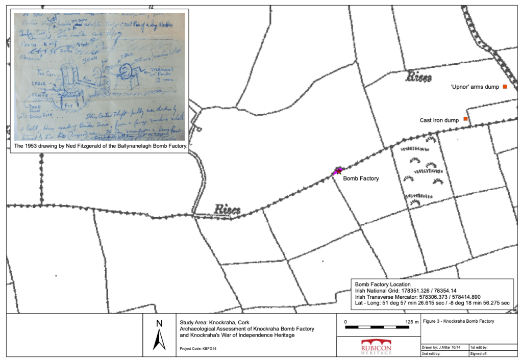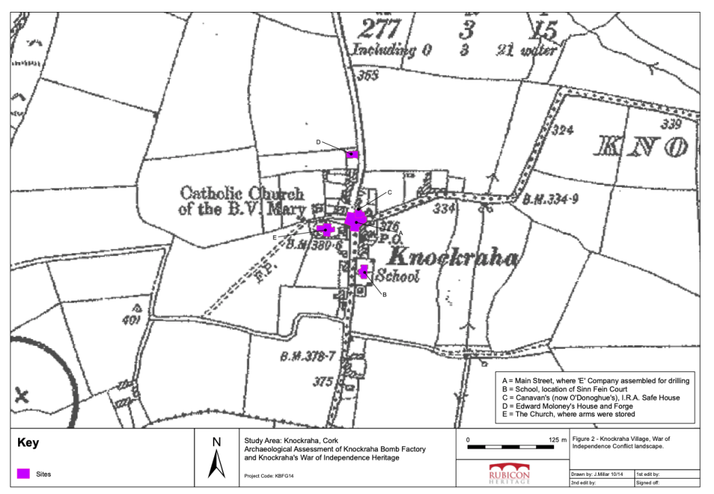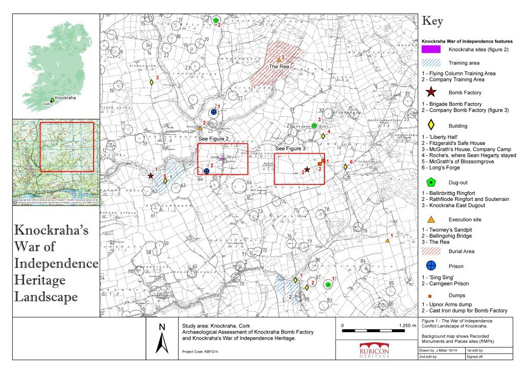 In 2014 Rubicon Heritage Services Ltd were appointed by the Knockraha Area Historical & Heritage Society two undertake a desk-based assessment of a potential War of Independence-era bomb factory. Following consultation it was decided to undertake a full assessment of all the potential sites in the locality associated with the local IRA unit- “E” Company of the 4th Battalion, Cork No. 1 Brigade, IRA. Working with the local community, who had undertaken significant research into the revolutionary history of their area, a report on the Company landscape was produced (which you can read here) together with a series of maps of the area. Following the production of the report, the Society developed a local Independence Way with support from Cork County Council (you can find the website here).